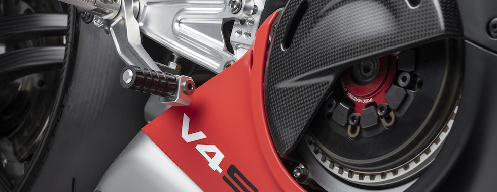 Other enhancements include lighter 5-split spoke carbon wheels (1.4 kg lighter than the aluminium forged ones of the Panigale V4 S) exclusive Brembo Stylema R® front brake calipers, and Rizoma footpegs in anodized aluminium with carbon fibre heel guards.